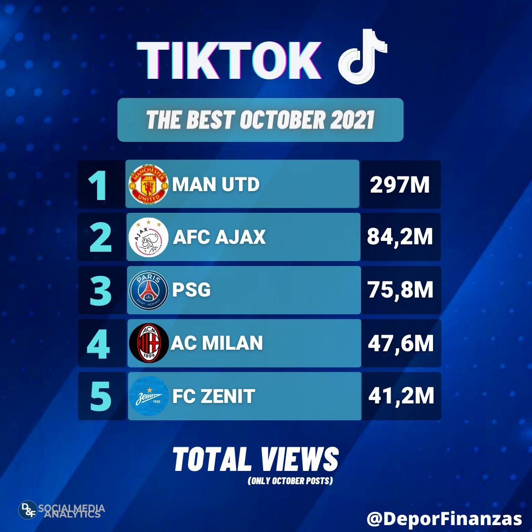 По итогам октября «Зенит» занял пятую позицию по общему числу просмотров видео в TikTok среди всех футбольных клубов мира. Данные опубликовало аналитическое агентство Deportes& Finanzas. В общей сложности ролики сине-бело-голубых собрали 41,2 миллиона просмотров.