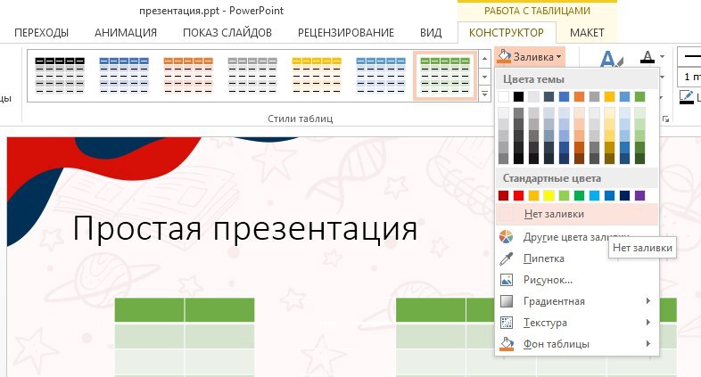 Для начала кликните по ячейке и перейдите в «Конструктор». В меню найдите «Стили таблиц» и выберите кнопку «Фон таблицы» — здесь кликните по понравившемуся цвету или зажмите «Нет заливки».