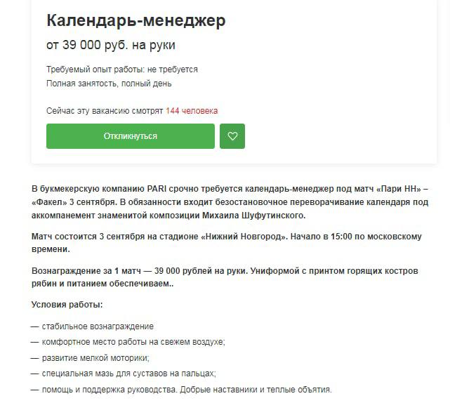 Тренд подхватила букмекерская компания PARI. На днях в Нижнем Новгороде они начали искать «Календарь-менеджера». 3 сентября во время матча «Пари НН» – «Факел» ему необходимо будет переворачивать календарь под Шуфутинского. За сложный труд компания обещает заплатить 39 000 рублей на руки. В отличие от предыдущей вакансии, объявление очевидно является частью рекламной кампании события.