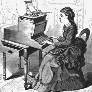 На картинке - одна из первых машинисток. Разумеется, в турнюре - она девушка приличная. Она пока еще не видит, что у нее получается, но клавиатура уже привычная нам qwerty, специально придуманная, чтобы печатать было как можно неудобнее (это классический кейс, хорошо известный всем специалистам по истории технологии). Если вам кажется, что она похожа на пианистку, то вам не кажется!