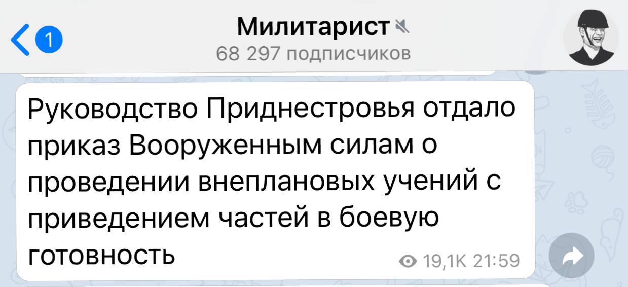 В Telegram появилось сообщение, что руководство Приднестровья отдало приказ Вооруженным силам о проведении внеплановых учений с приведением частей в боевую готовность.