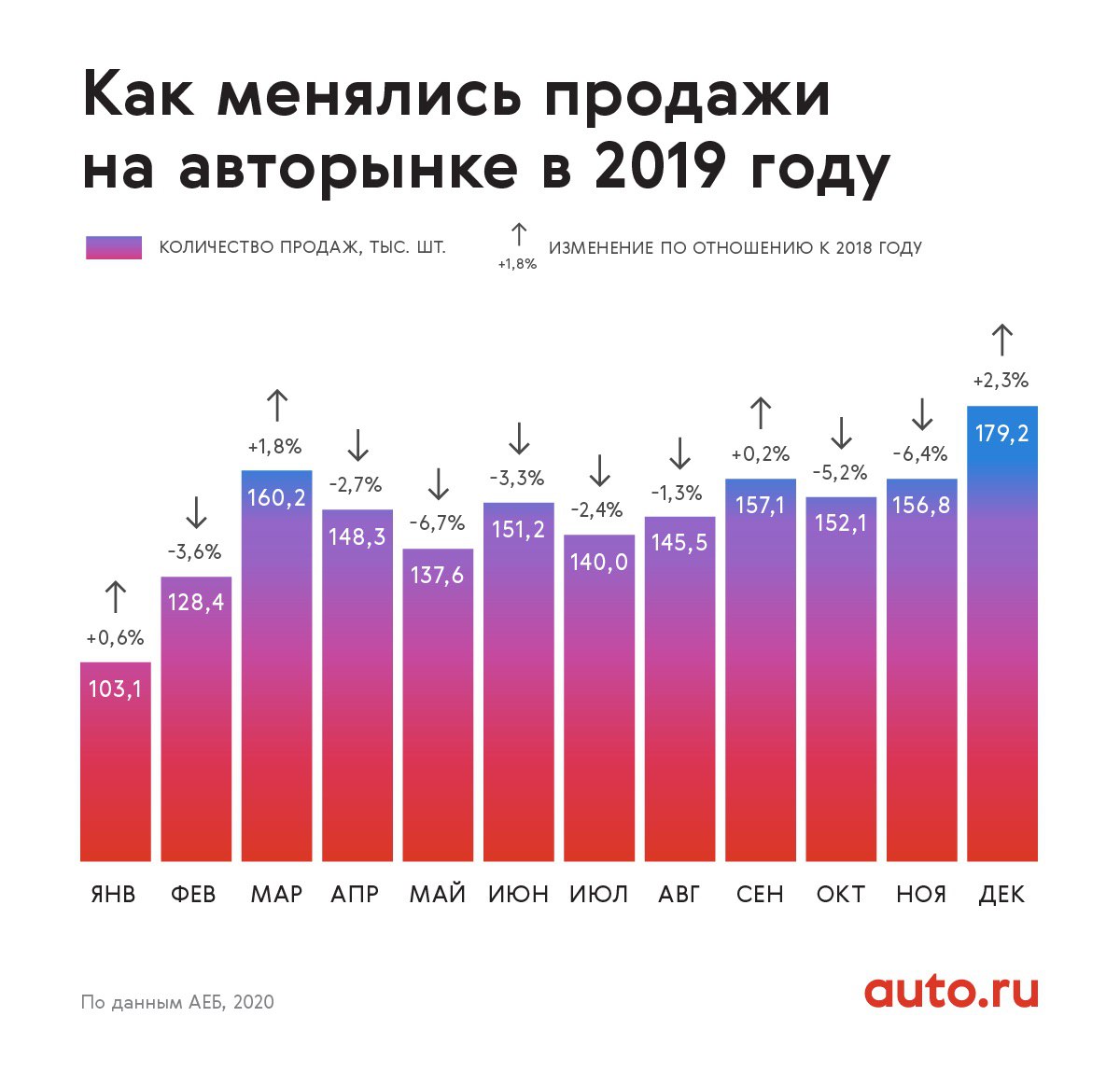 Инфографика от auto.ru pro продажи новых а/м (легковые и LCV) в 2019 в динамике по месяцам.