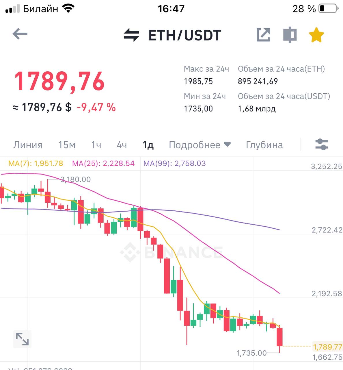 👉Эфир упал до отметки 1735$