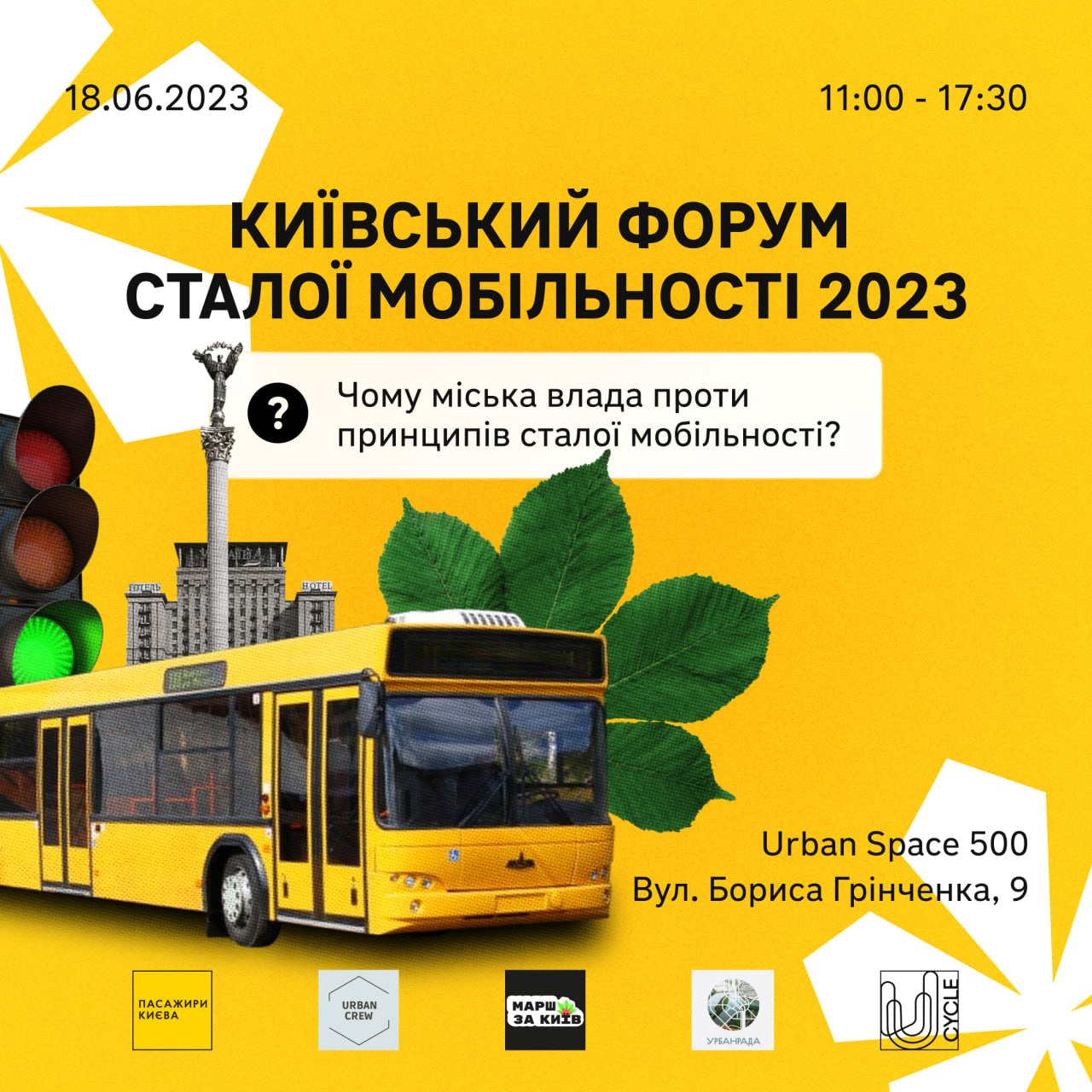 18 червня з 11:00 в Urban Space 500 пройде форум, де планується обговорити проблеми сталої мобільності, зокрема громадського транспорту, велосипедної та пішохідної інфраструктури Києва та напрацювати конкретні шляхи їх вирішення.