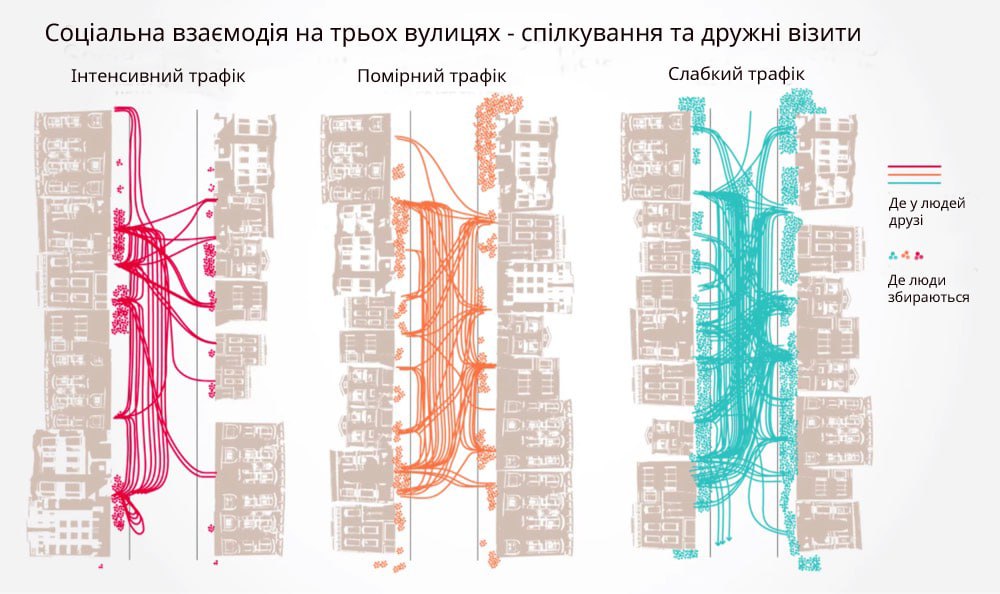 Наведена ілюстрація стала всесвітньо відомою, адже наочно демонструє наскільки активнішою є соціальна складова житлових районів і наскільки більше люди цінують вулицю, де живуть, якщо вона безпечніша та на ній менший трафік.