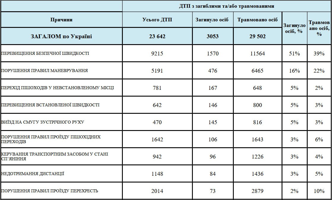 1️⃣ Більше 50% від всіх загиблих забрали ДТП через перевищення безпечної швидкості (1570 людей).
