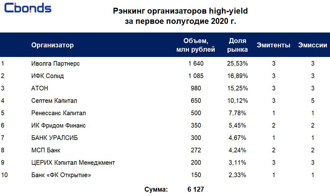 💡Рэнкинг организаторов рыночных выпусков high-yield по итогам первого полугодия 2020 года