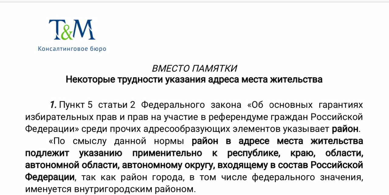 Материал рассчитан как на начинающего, так и на опытного участника избирательной кампании. Мы понимаем, что нельзя объять необъятное, посему на частные вопросы по поводу конкретных адресообразующих элементов и необходимости их указания мы готовы ответить в частном порядке.
