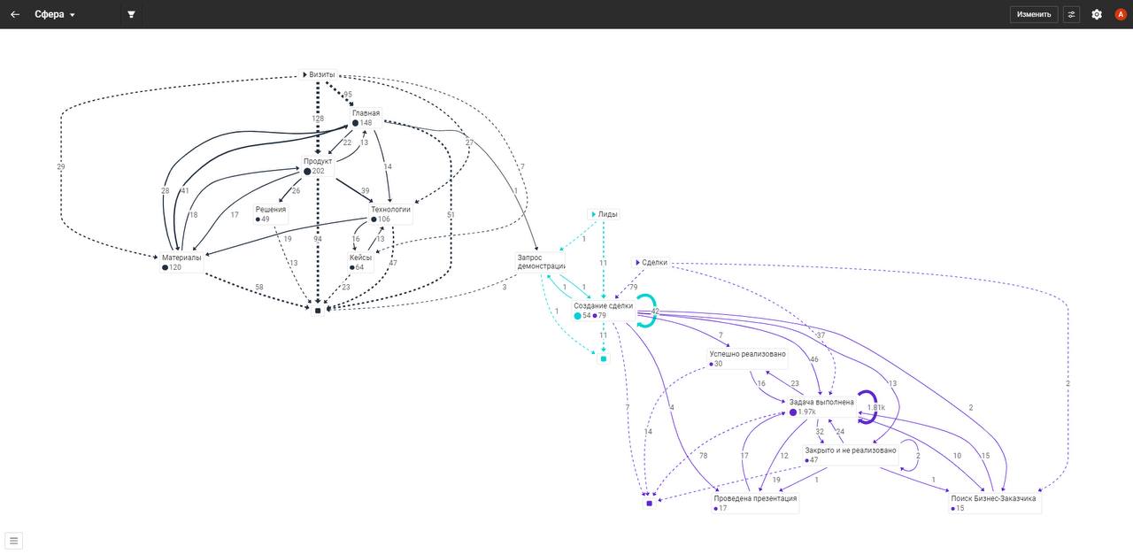 «Сфера процессов» – это основной виджет в мультипроцессной аналитике, который позволяет исследовать бизнес-процессы не по отдельности, а в совокупности и с учетом их влияния друг на друга.