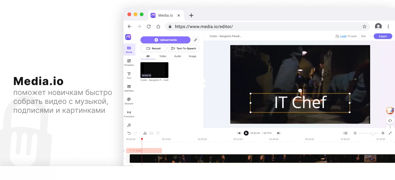 Бесплатное онлайн‑приложение от Media.io поможет новичкам быстро собрать видео с музыкой, подписями и картинками. В нём нет сложных эффектов, но доступны базовые инструменты.