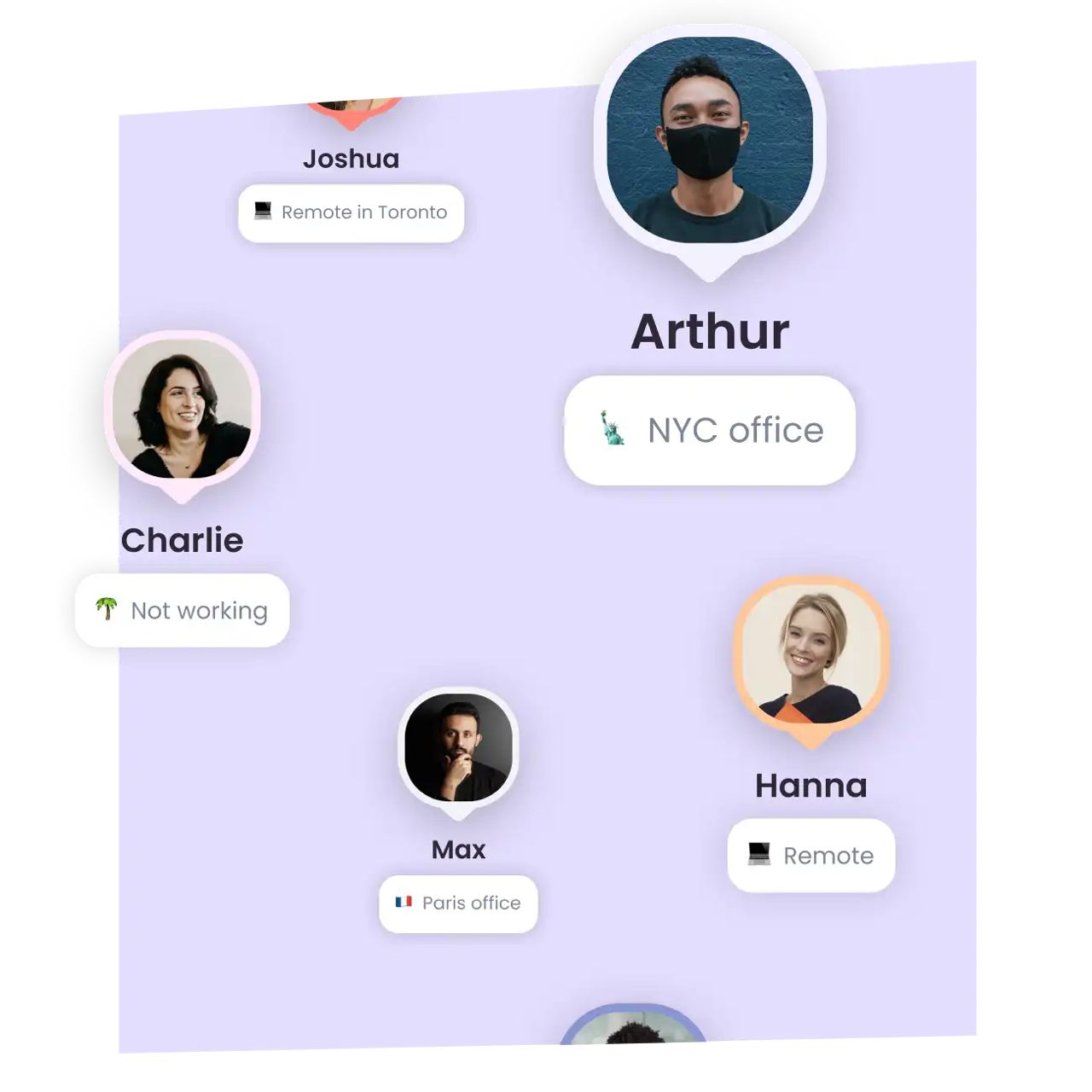 Установите свой статус на неделю (офис в Нью-Йорке, WFH (work from home), отпуск) и узнайте, кто будет в офисе в ближайшие дни.