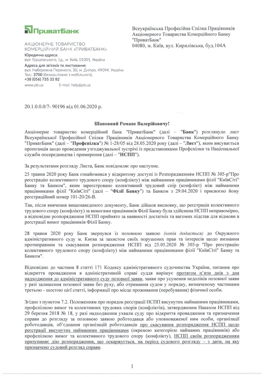 Исполненный мужества и уважения к сотрудникам ПриватБанка господин Петр Крумханзл уведомил наш Профсоюз о том, что ПриватБанк подал в суд на решение Национальной службы посредничества и примирения о регистрации коллективного трудового спора между сотрудниками КиевСити и администрацией ПриватБанка.