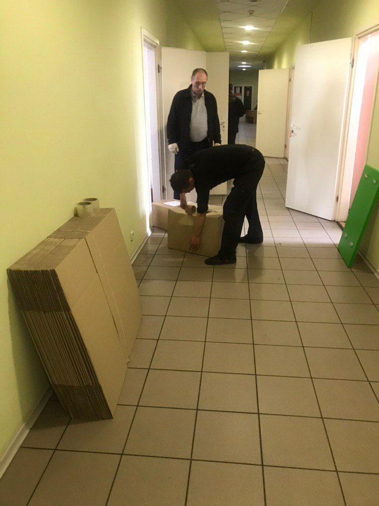Незнакомые люди разбирают и пакуют мебель в помещении филиала.