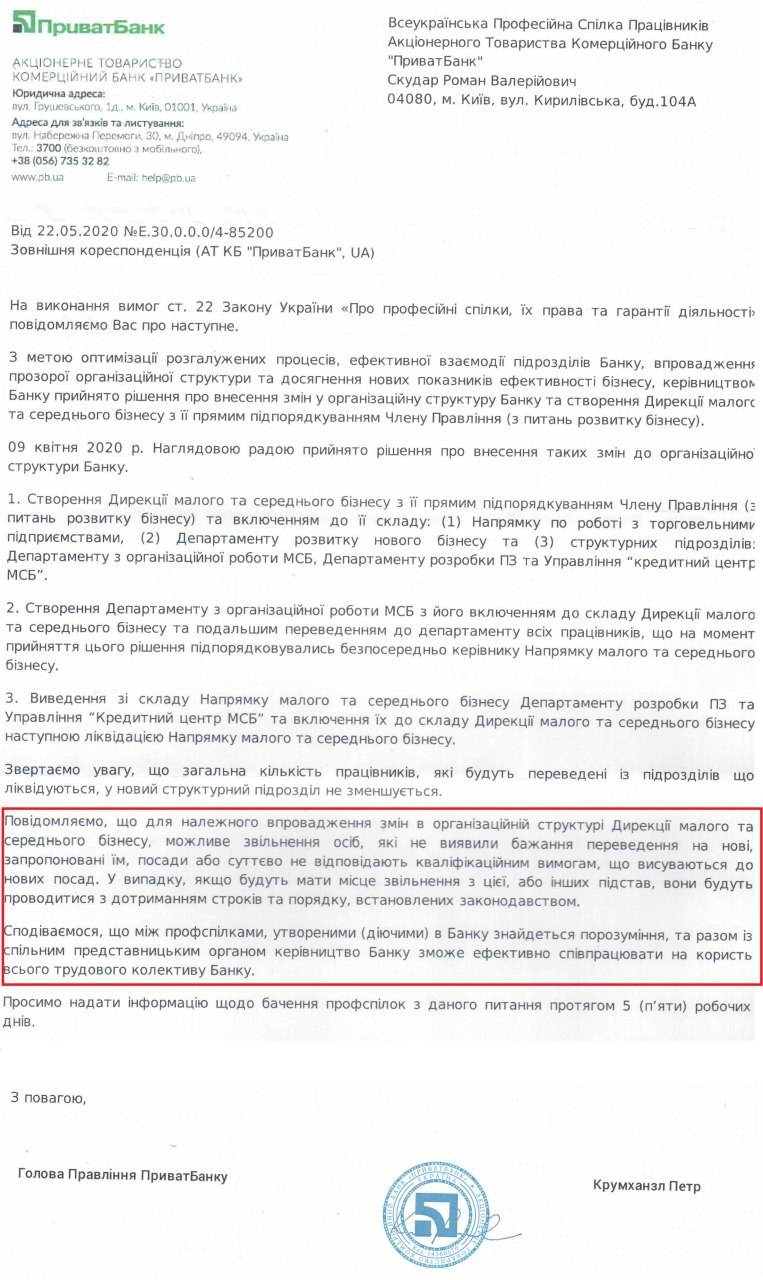 Но еще за две недели до этого господин Крумханзл в официальных документах в адрес Нашего профсоюза продолжал рассказывать как банк буквально героически соблюдает украинские законы и как сильно ценит своих сотрудников: