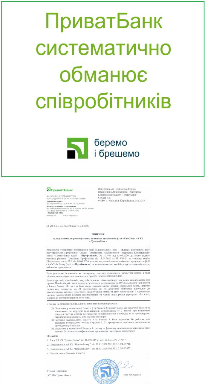 Но еще за две недели до этого господин Крумханзл в официальных документах в адрес Нашего профсоюза продолжал рассказывать как банк буквально героически соблюдает украинские законы и как сильно ценит своих сотрудников: