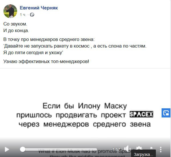 Наши корреспонденты через @ProfPrivatBot обратили наше внимание, что небезызвестный Евгений Черняк запостил в фейсбуке хороший ролик про нерадивых менеджеров среднего звена: