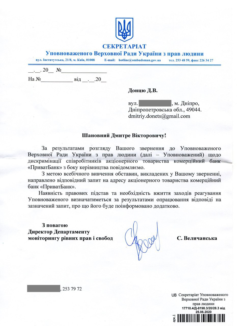 Секретариат Уполномоченного Верховной Рады Украины по правам человека уведомил профсоюз о том, что затребовал в ПриватБанке пояснения в отношение фактов дискриминации в трудовых отношениях с сотрудниками Направления трудовые ресурсы (HR).