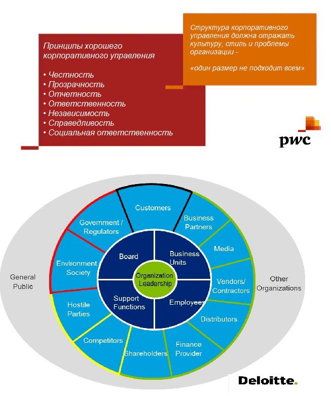 После потрясений финансового мира 2008 года большинство заинтересованных лиц (люди, компании, регуляторы, страны, регионы, …) потратили приличное количество сил, энергии и денег для построения модели организации, способной выживать в длительной перспективе, принося максимум пользы и минимум вреда акционерам, инвесторам, правительствам, обществу людям. Придуманная концепция не вносит революционных идей, но предлагает построить систему, позволяющую учесть интересы большинства заинтересованных групп и не дать определенным группам допустить масштабных злоупотреблений. Концепция Разделения властей. Система сдержек и противовесов. В общем все стандартно для последнего тысячелетия человечества.