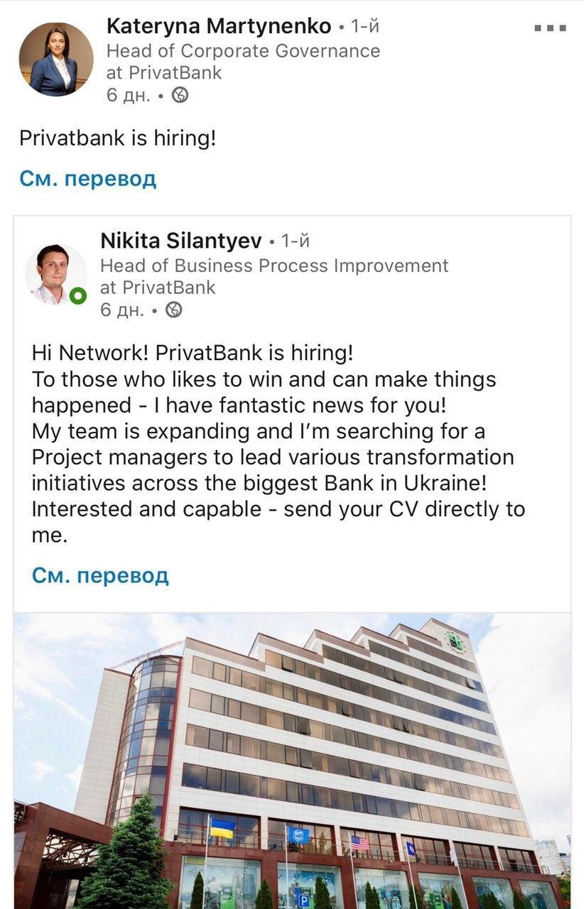 Мартыненко Екатерина (Руководитель Управления по корпоративному управлению ГО) шерит в фейсбуке радостный пост Силантьева Никиты (Руководитель Управления по совершенствованию бизнес-процессов ГО) о найме сотрудников в ПриватБанк.