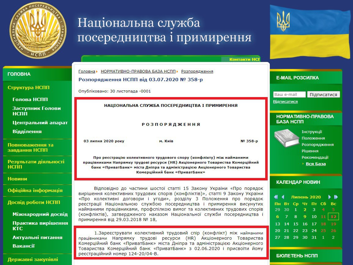“Зареєструвати колективний трудовий спір (конфлікт) між найманими працівниками Напрямку трудові ресурси (HR) Акціонерного Товариства Комерційний банк «ПриватБанк» міста Дніпра та адміністрацією Акціонерного Товариства Комерційний банк «ПриватБанк» з 02.06.2020 і присвоїти йому реєстраційний номер 124-20/04-В”.