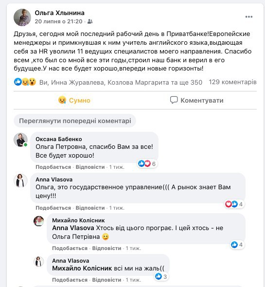 "Набрел в фейсбуке на пост Ольги Хлыниной о ее незаконном увольнении из ПриватБанка. В числе первых комментариев можно увидеть тревожные сообщения от Анны Власовой и Михайла Колисныка - легендарных преподавателей Киево-Могилянской бизнес школы.