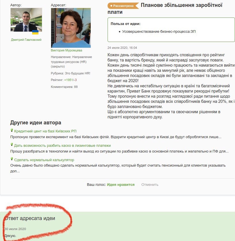 Идея была рассмотрена и руководство банка дало ответ в своём фирменном стиле «дякую»".