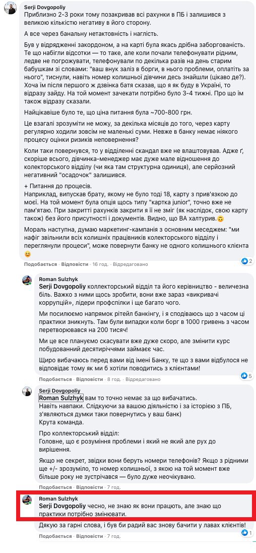 Член наблюдательного совета ПриватБанка Роман Сульжик в социальной сети facebook перед широкой украинской общественностью поделился мыслями о некачественной работе “коллекторского отдела” ПриватБанка под постом человека, заявившего о нетактичности и наглости неназванных лиц, якобы требовавших закрытия задолженности по карте.