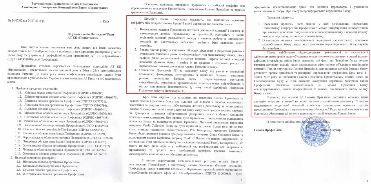 Как мы писали ранее 24 июля 2019 года Наш Профсоюз уведомил так называемый “наблюдательный совет ПриватБанка” о конфликте между трудовым коллективом банка и правлением и о попытках правления растратить/разбазарить активы банка (https://t.me/profprivat/247).