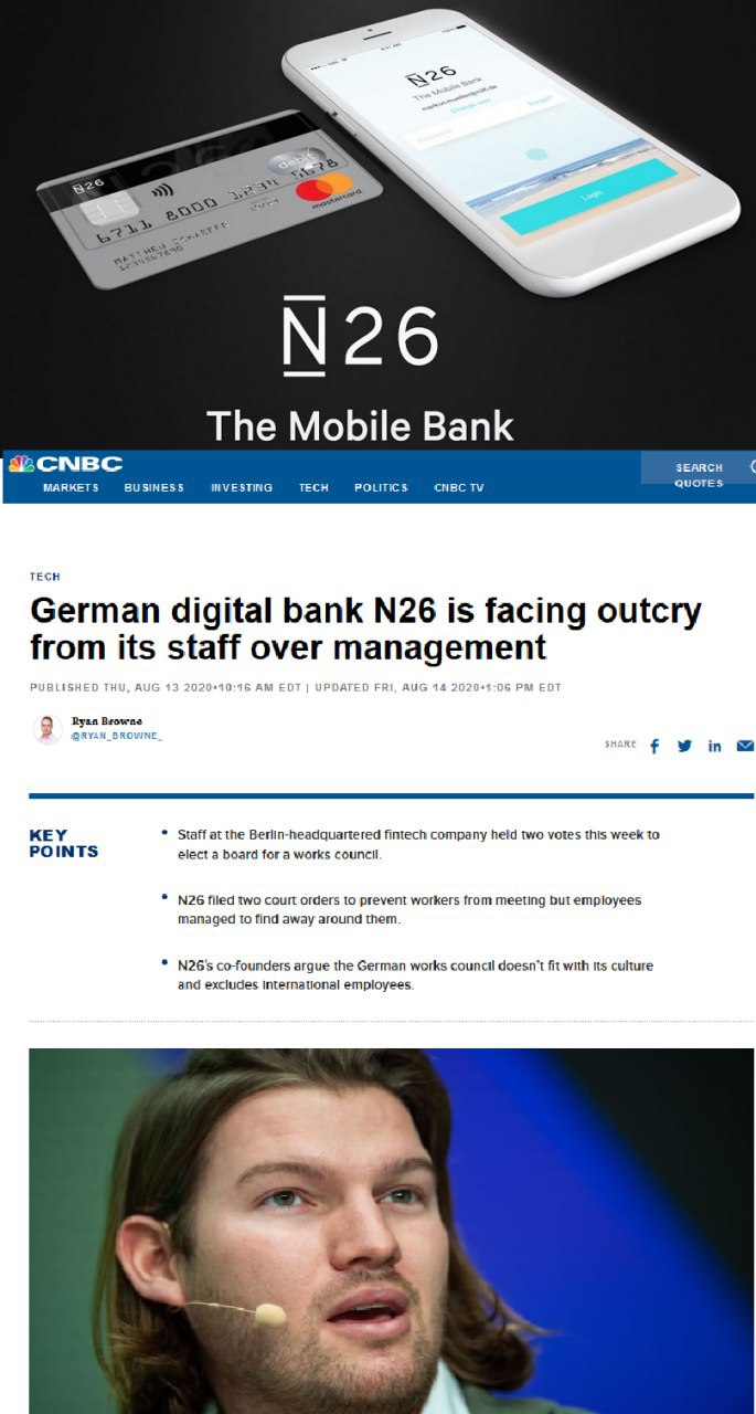 Основатель компании Валентин Стальф принес извинение за «усугубление конфликта» после того, как попытался помешать встрече сотрудников в берлинском баре, ссылаясь на беспокойство по поводу здоровья и безопасности. Один из сотрудников рассказал Forbes, что речь шла не столько о коронавирусе, сколько о подрыве деятельности по организации собрания трудового коллектива. По его словам, уровень «доверия и уверенности» в руководстве N26 «как никогда низок».