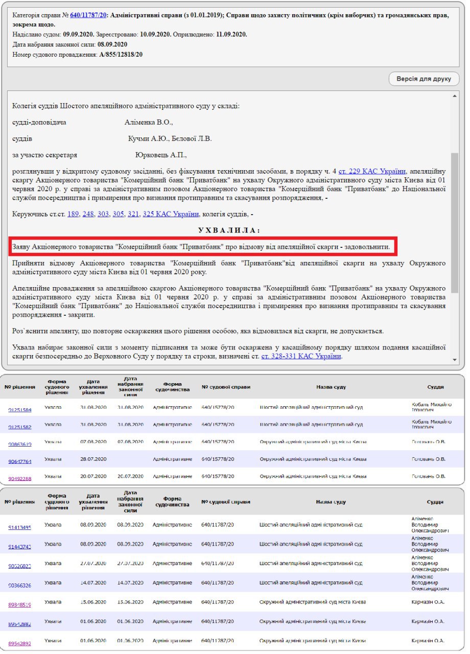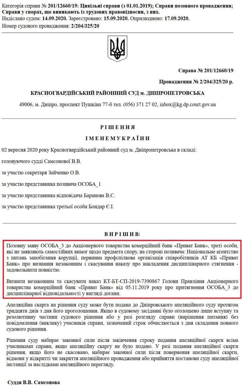Рішенням Жовтневого районного суду міста Дніпропетровська та постановою Дніпровського апеляційного суду від 06 серпня 2020 року визнано незаконним та скасовано наказ АТ КБ «ПриватБанк» № 6931368 від 13 червня 2019 року. В іншій частині позову відмовлено.