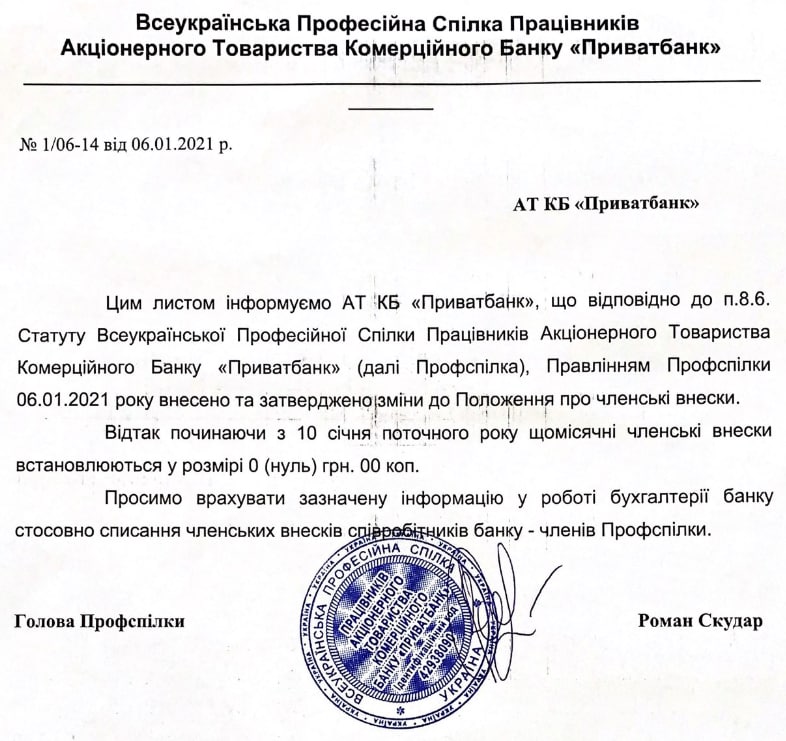 информируем вас, что решением Правления Профсоюза с 10.01.2021 размер членских взносов уменьшен до 0 грн. в связи с чем правлению банка было направлено письмо о прекращении удержания взносов из заработной платы сотрудников.