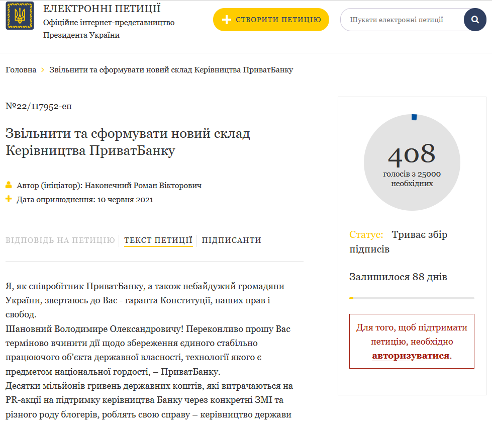 Сотрудниками банка на Интернет сайте "Електронні петиції. Офіційне інтернет-представництво Президента України" создана петиция к Президенту Украины №22/117952-еп "Звільнити та сформувати новий склад Керівництва ПриватБанку":