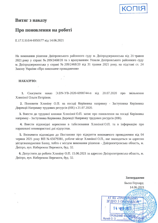 3. Внести до трудової книжки Хлиніної О.П. запис про поновлення на посаді Керівника напрямку - Заступника Керівника Дирекції Напрямку трудових ресурсів (НК).