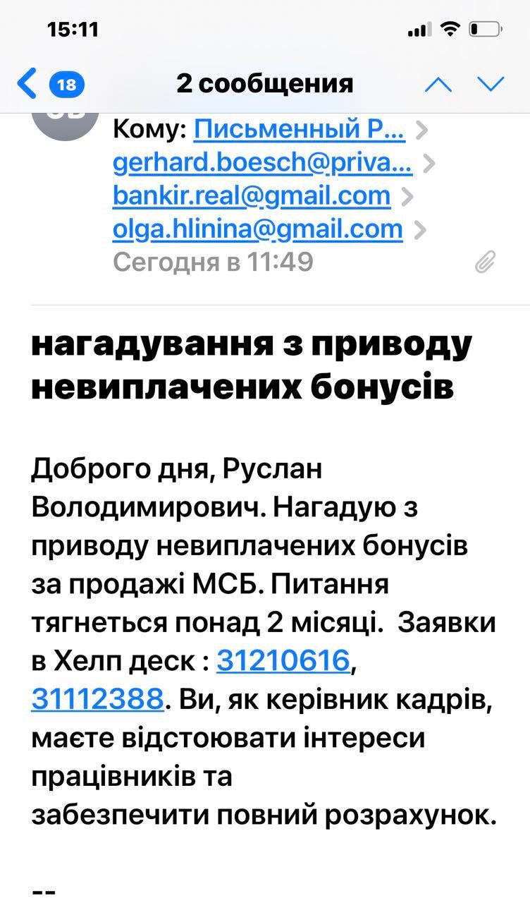 Понимая вышеизложенное хотим информировать руководство, что к нам поступили десятки обращений о невыплаченной премии. Господин Герхард к вам лично обратился сотрудник, по вопросу невыплаченной премии. Просим вас публично предоставить ответ, надеемся с информацией о дате выплаты и мерами которые вы предпримите к лицам допустившим нарушения.