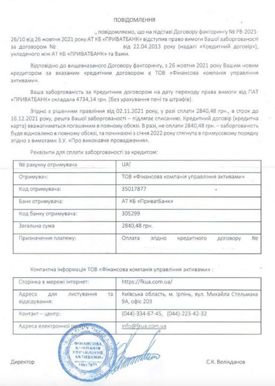 Клиенту пришло письмо, что его долг в размере 4 734 грн, был уступлен ПриватБанком 26.10.2021, после этой даты новым кредитором являетсякомпании ТОВ “Фінансова компанія управління активами” на основании этого компания требует с клиента уже 2 840 грн, что составляет 60% от суммы долга, а купили внимание за 2,4%, мы напомним новость!