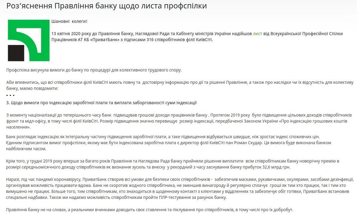 Наш профсоюз получил письмо ПриватБанка из которого следует, что все требования сотрудников филиала, кроме требований по индексации заработной платы, правлением отклонены. Требование об индексации будет выполнено частично.
