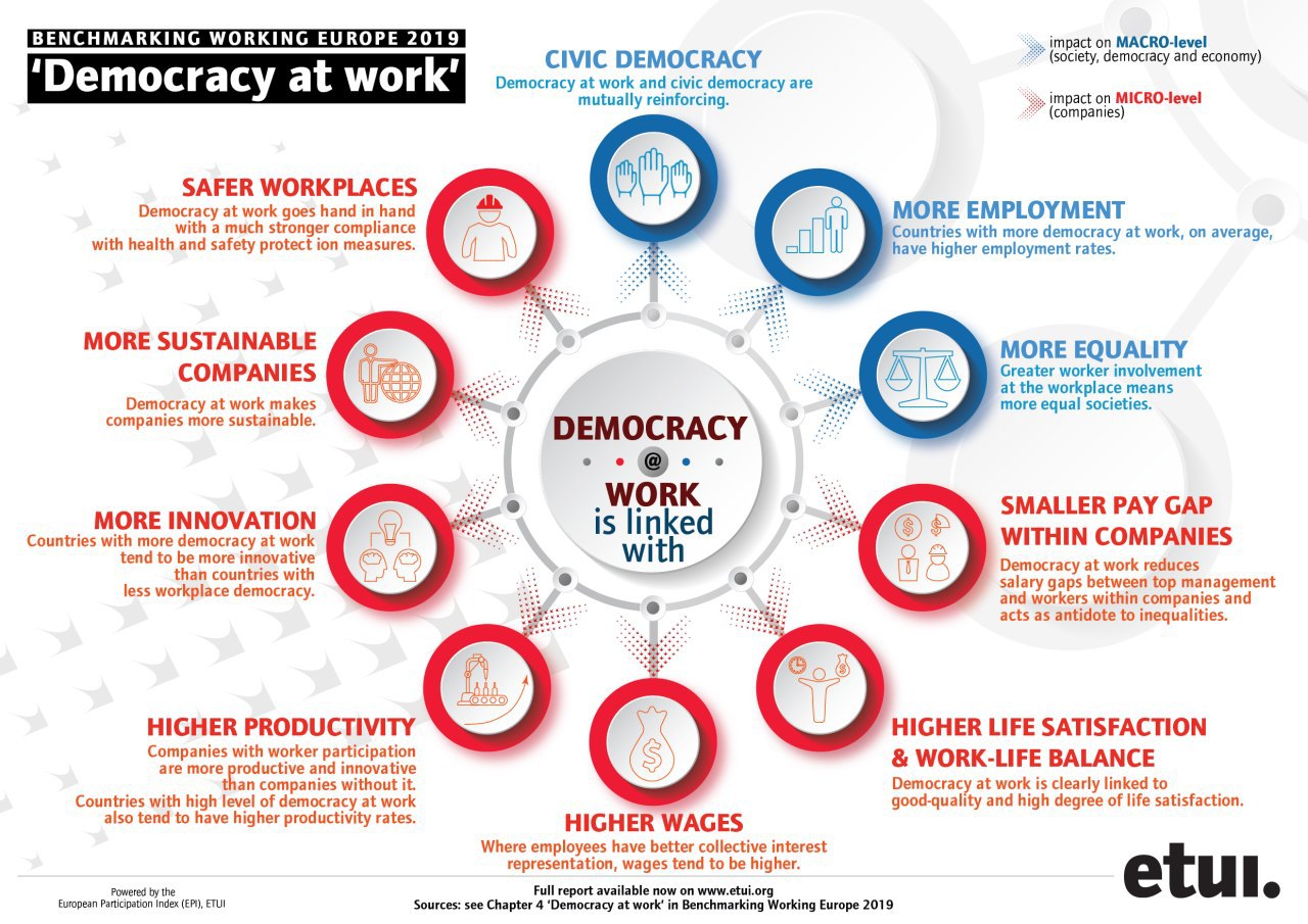 Ежегодный обзор европейских экономических проблем, рынка труда и социальных вопросов «Бенчмаркинг рабочая Европа 2019» приводит доказательства того, что участие сотрудников в управлении компанией обеспечивают целый ряд преимуществ для сотрудников и для владельцев компаний (http://fr.worker-participation.eu).