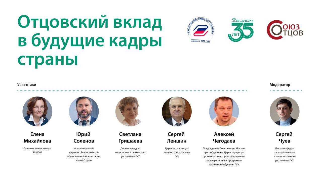 🔹Чегодаев Алексей Михайлович, председатель Совета отцов Москвы при омбудсмене, директор по развитию ВОО Союз отцов, преподаватель ГУУ, директор центра проектного менторства Управления акселерационных программ и проектного обучения ГУУ.