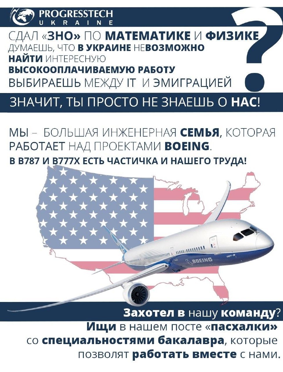 Наша компания предлагает неординарную увлекательную работу над проектами американской аэрокосмической корпорации Boeing✈️🇺🇸 в Украине. Скучно и однообразно точно не будет!