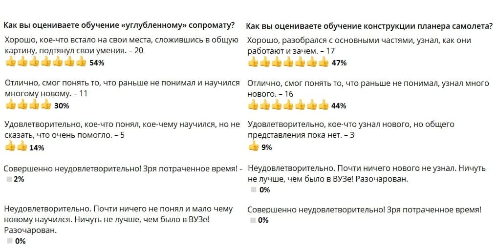 Поэтому сегодня мы хотим рассказать вам, как слушатели оценили качество обучения второй части сопротивления материалов и конструкции пассажирских самолетов – смотрите на прикрепленные изображения!
