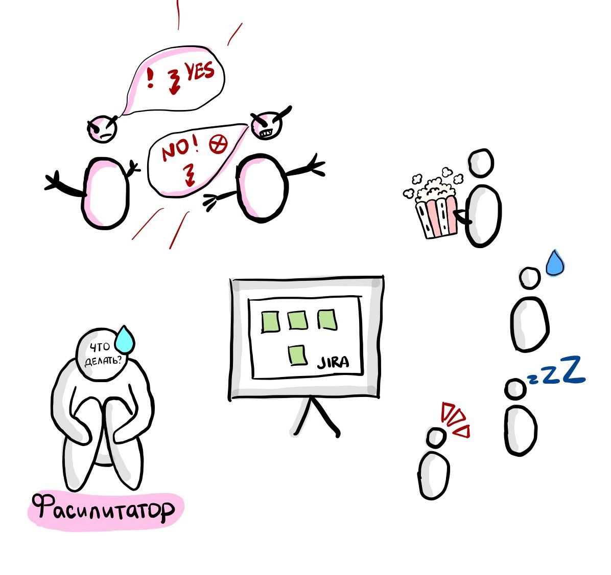 😳 «Как фасилитировать конфликт на встрече? В моих командах люди временами зарубаются друг с другом. И вот двое-трое ругаются, а остальная группа смотрит на меня мол: «Эй, ты фасилитатор или как? Решай давай!». Последний раз наш архитектор даже в чат мне написал чтобы я вмешался. Как быть?»