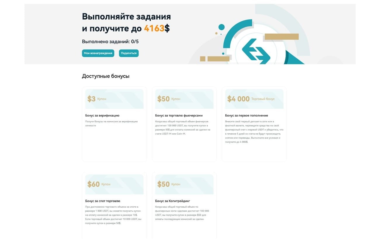 🎁$4,000 торговый бонус за первое пополнение: внесите свой первый депозит через сеть блокчейна или в фиатной валюте, переведите средства на свой фьючерсный и убедитесь, что внесенные средства хранятся на вашем счете в USDT до тех пор, пока не будут распределены торговые бонусы и купоны.