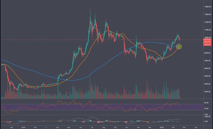 ββΠΠ° Π³ΡΠ°ΡΠΈΠΊΠ΅ Π±ΠΈΡΠΊΠΎΠΈΠ½Π° ΠΎΠ±ΡΠ°Π·ΠΎΠ²Π°Π»ΡΡ Β«ΠΠΎΠ»ΠΎΡΠΎΠΉ ΠΊΡΠ΅ΡΡΒ» (ΠΏΠ΅ΡΠ΅ΡΠ΅ΡΠ΅Π½ΠΈΠ΅ 50-Π΄Π½Π΅Π²Π½ΠΎΠΉ ΠΈ 200-Π΄Π½Π΅Π²Π½ΠΎΠΉ ΡΠΊΠΎΠ»ΡΠ·ΡΡΠΈΡ