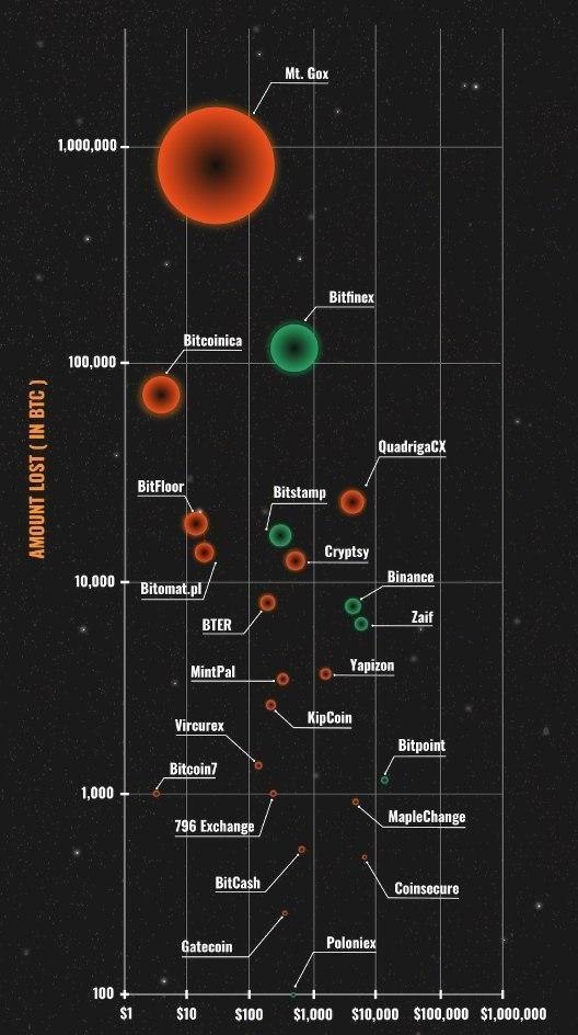Нижняя вертикальная строка — курс биткоина на момент взлома, вертикальная – сумма украденного.