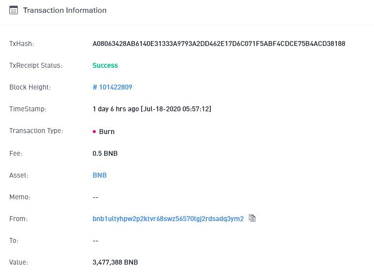 ΠΠΆΠ΅ΠΊΠ²Π°ΡΡΠ°Π»ΡΠ½ΠΎ Binance Π½Π° 20% ΡΠ²ΠΎΠ΅Π³ΠΎ Π΄ΠΎΡ ΠΎΠ΄Π° Π²ΡΠΊΡΠΏΠ°Π΅Ρ ΠΈ ΡΠΆΠΈΠ³Π°Π΅Ρ ΠΌΠΎΠ½Π΅ΡΡ BNB. ΠΡΠΎ Π±ΡΠ΄Π΅Ρ ΠΏΡΠΎΠ΄ΠΎΠ»ΠΆΠ°ΡΡΡΡ Π΄ΠΎ ΡΠ΅Ρ ΠΏΠΎΡΠ°, ΠΏΠΎΠΊΠ° Π½Π΅ Π±ΡΠ΄Π΅Ρ ΠΈΡΡΠ΅ΡΠΏΠ°Π½ΠΎ 50% ΠΎΡ ΠΎΠ±ΡΠ΅Π³ΠΎ ΠΏΡΠ΅Π΄Π»ΠΎΠΆΠ΅Π½ΠΈΡ. Π ΠΊΠΎΠ½Π΅ΡΠ½ΠΎΠΌ ΠΈΡΠΎΠ³Π΅ ΠΎΡΡΠ°Π½Π΅ΡΡΡ ΡΠΎΠ»ΡΠΊΠΎ 100 ΠΌΠ»Π½ BNB.