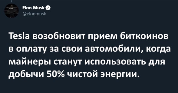 ββπ₯ΠΠ»ΠΎΠ½ ΠΠ°ΡΠΊ Π·Π°ΡΠ²ΠΈΠ», ΡΡΠΎ Tesla Π²ΠΎΠ·ΠΎΠ±Π½ΠΎΠ²ΠΈΡ ΠΏΡΠΈΠ΅ΠΌ BTC Π² ΠΊΠ°ΡΠ΅ΡΡΠ²Π΅ ΠΎΠΏΠ»Π°ΡΡ, Π΅ΡΠ»ΠΈ ΠΊΡΠΈΠΏΡΠΎΠ²Π°Π»ΡΡΠ° ΡΡΠ°Π½Π΅Ρ ΡΠΈΡΠ΅.