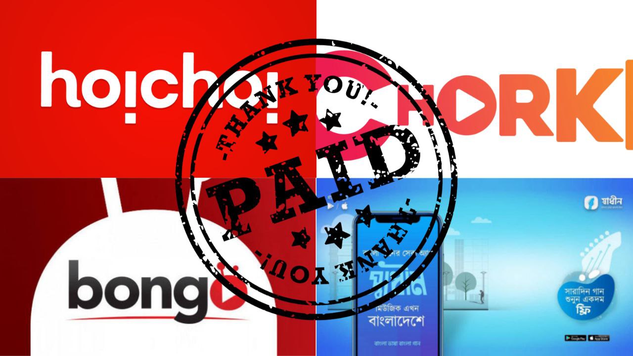 আসসালামু আলাইকুম, আমরা অত্যান্ত দুঃখের সাথে বলবো যে আমাদের Hoichoi, Chorki,Bongo,এবং Shadhin Music কেউ নষ্ট করে দিচ্ছে কোন কারন ছাড়াই। তাই আমরা চিন্তা ভাবনা করে দেখলাম আমরা আমাদের Apps গুলো Paid করে ফেলবো অল্প কিছু টাকা তে।