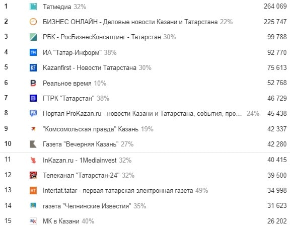 К топ-15 подбираются и могут скоро туда войти портал Сhelny-biz и газета «Шахри Казан» (на скрине не видно), также перспективно идут «НТР-24» и «АиФ Казань», но их успех гарантирован только при условии падения других.