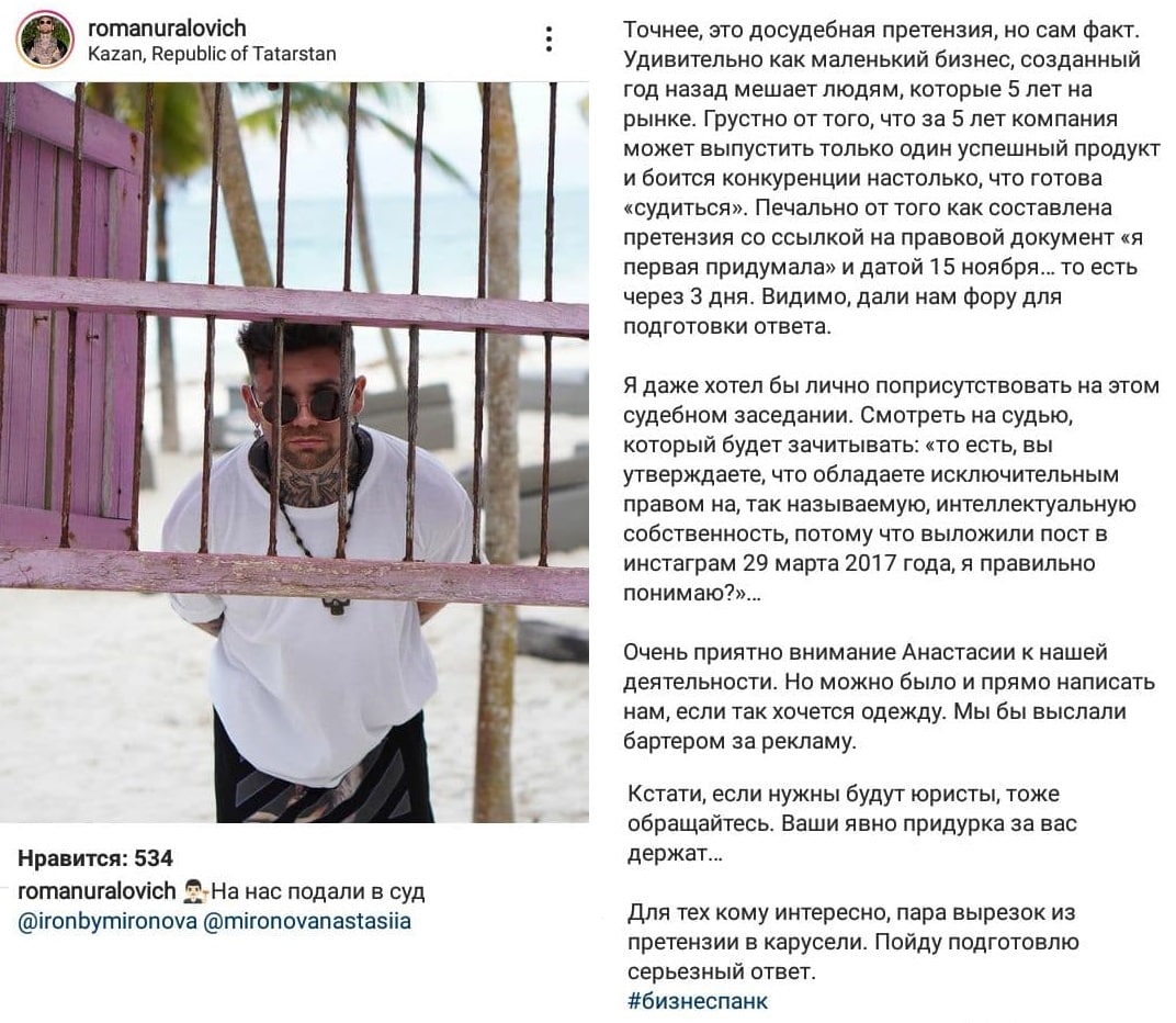 Это смешно: инфоцыган и маркетинговый гуру Роман Уралович возмущен, что на него подали в суд за стыренный дизайн лосин. За это Рома стебет предъявившую претензии блогерку Анастасию Миронову и ее раскрученный бренд. Видимо, потому что возмущаться украденными у тебя наработками нельзя.