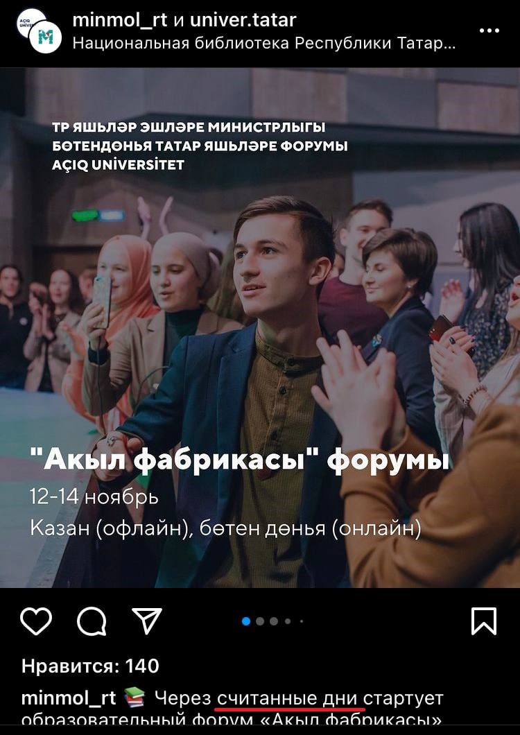 Кажется, ошибки и опечатки в аккаунтах госструктур и чиновников — это обычная практика. К примеру, взгляни на аккаунт минмолодежи РТ. Идентичный пост с идентичной ошибкой. Можно понять, что он заказной и его сммщики просто скопировали и вставили, не обращая внимания на слова.